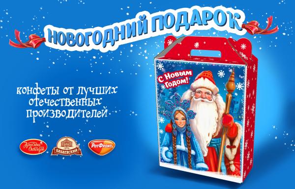 «Новогодний сладкий подарок включает в себя набор лучших шоколадных конфет московских фабрик: «Рот Фронт», «Бабаевский», «Красный Октябрь». Вес наполнения – 500 гр. Подарок не входит в стоимость билета на представление и приобретается отдельно!
