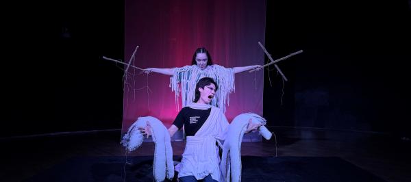 Античный миф о Медее через оптику мифологического мышления. В центре спектакля «Она – от Солнца рожденная...» - Медея как носительница архаической культуры, удаганка, жрица Огня, для которой семья, дом, дети, преданность и связь с предками – абсолютные, нерушимые ценности. Жанр – олонхо о Медее определяет способ существования актеров. Олонхо в спектакле – не произведение, а устная эпическая традиция, режиссерский прием, позволяющий актеру быть одновременно сказителем и участником событий, находиться внутри мифа и вне его. Монологи Медеи решены через тойук – древнее эпическое песнопение, которое не воспроизводит текст, а призывает духов, камлает, переносит и иное измерение. Здесь каждый предмет и жест обретают ритуальный смысл. Кормилица взбивает хлопок, для сотворения детей-кукол. В финале Медея сама обрывает нити жизни, подобно Мойрам, но совершает не убийство, а ритуал перехода, вознося детей в Верхний мир, к миру вечного Света. Это история не ревнивой детоубийцы, а о столкновении миров, где предательство стоит жизни, а смерть становится возвращением к свету.