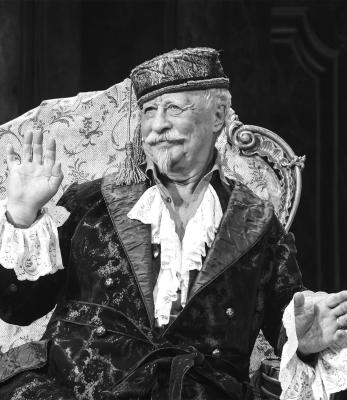Мир Гарпагона, каким его выстраивает сценограф Александр Цветной – стилизованная библиотека, настоящая обитель мыслителя, забитая фолиантами и прочими атрибутами кабинета европейского ученого. Здесь обитает человек, способный цитировать Теофраста, Менандра и даже Будду.
