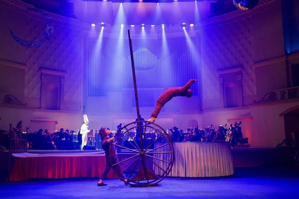 Ёжик дирижирует оркестром, Медвежонок взмывает под крышу концертного зала, на сцене вырастает огромная ёлка из нотных партитур. Всё это происходит в спектакле-фантазии, который часто сравнивают с представлениями «Цирка дю солей». Новогодняя сказка для Ёжика с оркестром — это микс разных жанров: хулиганская пантомима сочетается со звучанием симфонического оркестра, а сложная световая партитура рифмуется с высочайшего уровня акробатикой. Но главное — это теплая, смешная и трогательная история о любимых героях: возвышенном мечтателе Ёжике и реалистичном изобретателе Медвежонке.