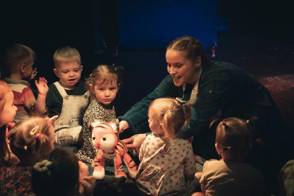 “ Для первого посещения ребенком театра остановили выбор на спектакле "Заинька" и остались в восторге. Дети в зале сидят на подушках, родители тоже на подушках за малышами. Место можно выбрать любое, видно и слышно везде хорошо. Спектакль музыкальный, интерактивный - дети активно задействованы на протяжении всего представления (пускают солнечных зайчиков, собирают грибы и ягоды, танцуют, показывают шум дождя с помощью реквизитов театра и многое другое). Есть возможность обратить внимание на актера (роль дедушки), который играет на разных музыкальных инструментах (ложки, треугольник и др.). Спектакль о смене времен года. Нашему ребенку в возрасте 2г.11м.сюжет был понятен, смотрел спектакль с удовольствием и восторгом. Рады, что выбрали этот театр и данный спектакль для первого знакомства. Остались яркие воспоминания и положительные впечатления. В театре тепло, нужна сменная обувь. Бахилы выдают, но в сменной обуви комфортнее.