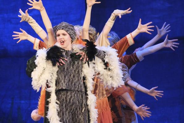 На сцене под живой оркестр танцуют и поют взрослые актеры вместе с детьми.