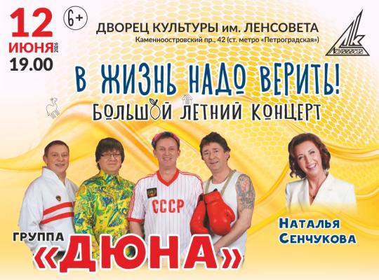 12 июня 2026г., в День России, в д.к. им. Ленсовета, состоится, эстрадный концерт «В жизнь надо верить!», с участием популярной группы «Дюна» и известной эстрадной певицы Натальи Сенчуковой.