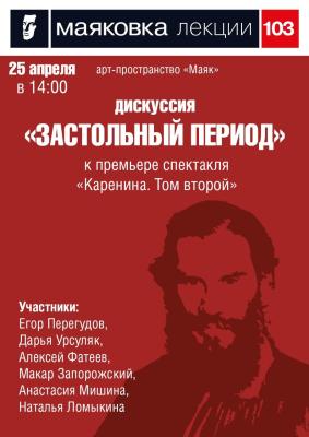 В рамках просветительской программы будущей премьеры «Каренина. Том второй» 25 апреля в 14:00 в арт-пространстве «Маяк» пройдет дискуссия «Застольный период» – встреча с режиссером, артистом и модератором-литературным критиком на этапе репетиционного процесса.