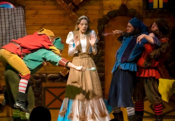 Спектакль по мотивам сказки братьев Гримм о волшебномЗеркале, о злой и коварной Королеве, о прекрасной Белоснежке и галантном Принцеи, конечно же, о семи весёлых братьях гномах.